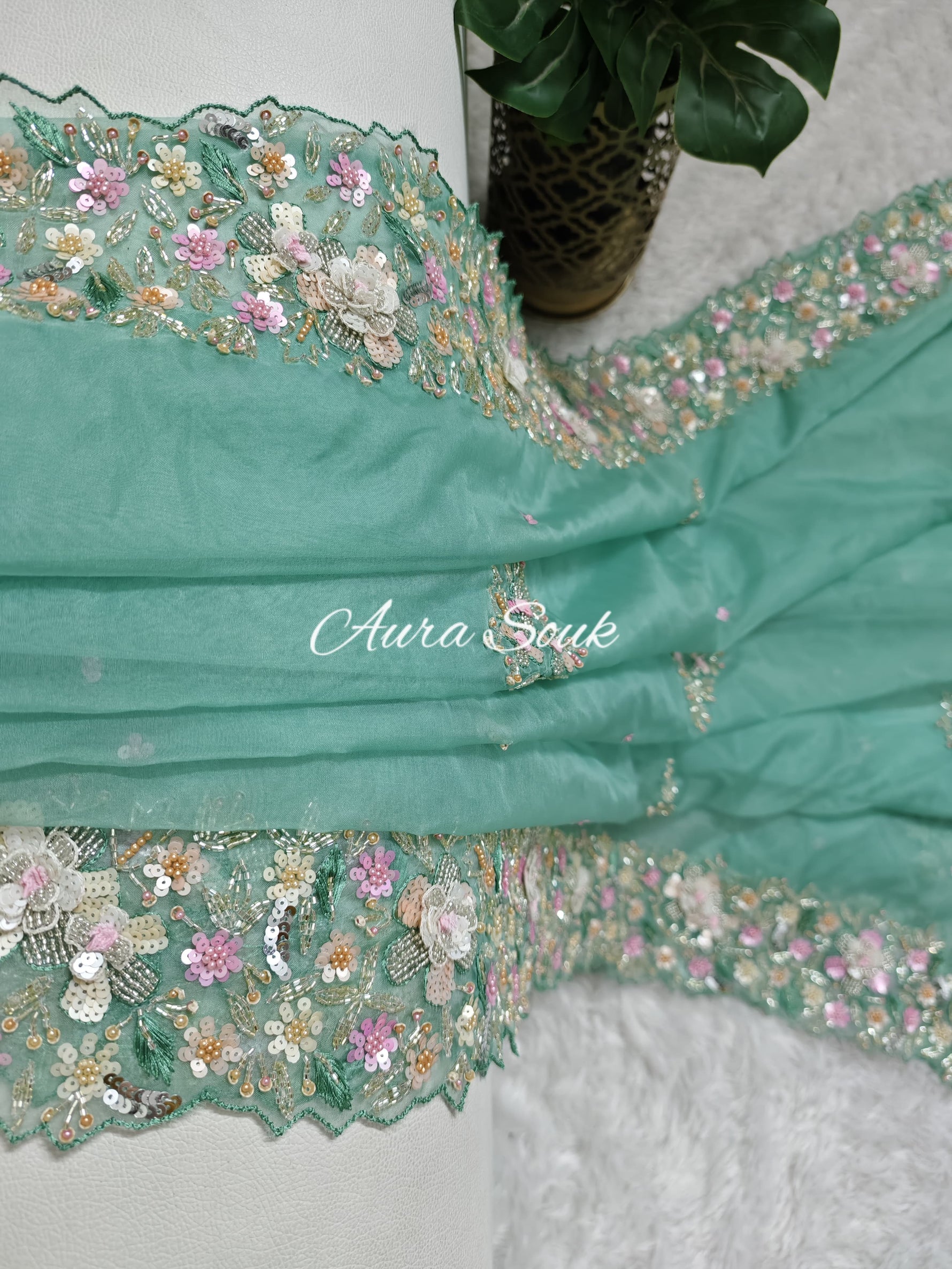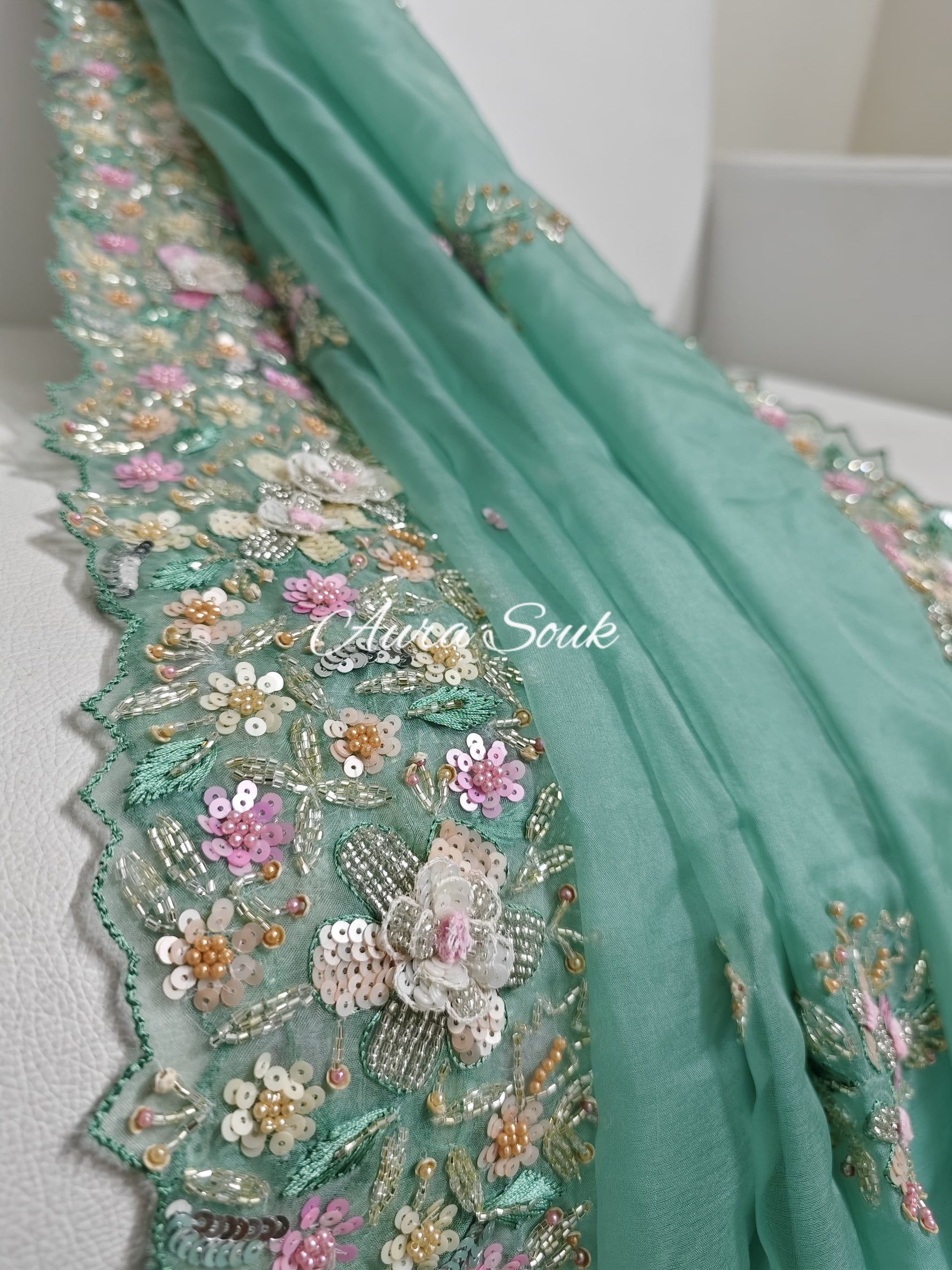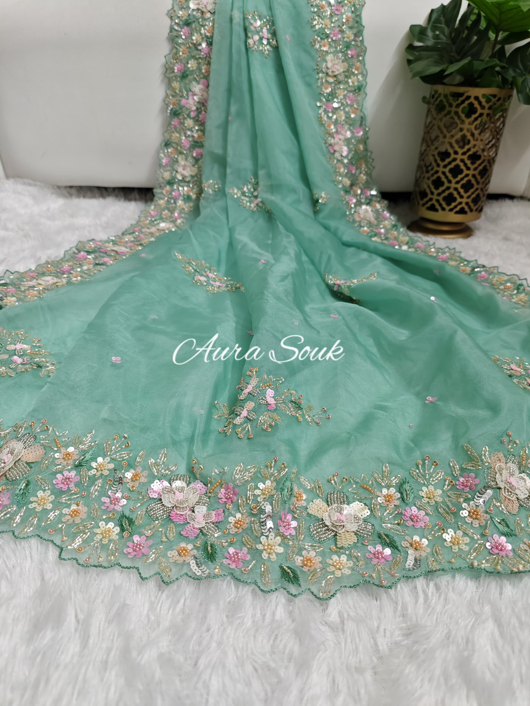 Unit price perAura Souk launches in-house design on Pure Organza with 3D embossed flowers and hand work using cutdana, sequins, pearls, beads and hand embroidery. Color can be customised if done on pure Organza .