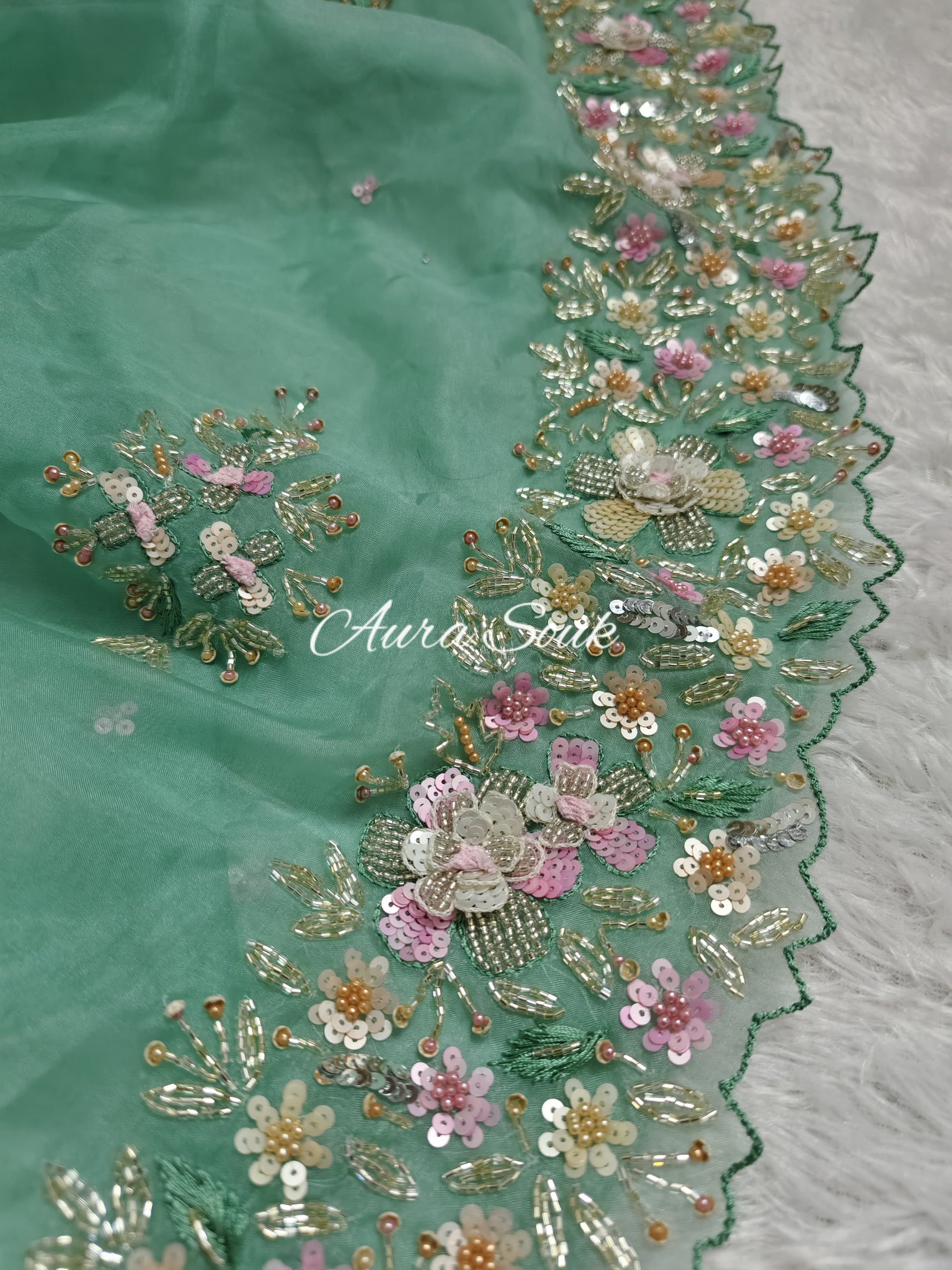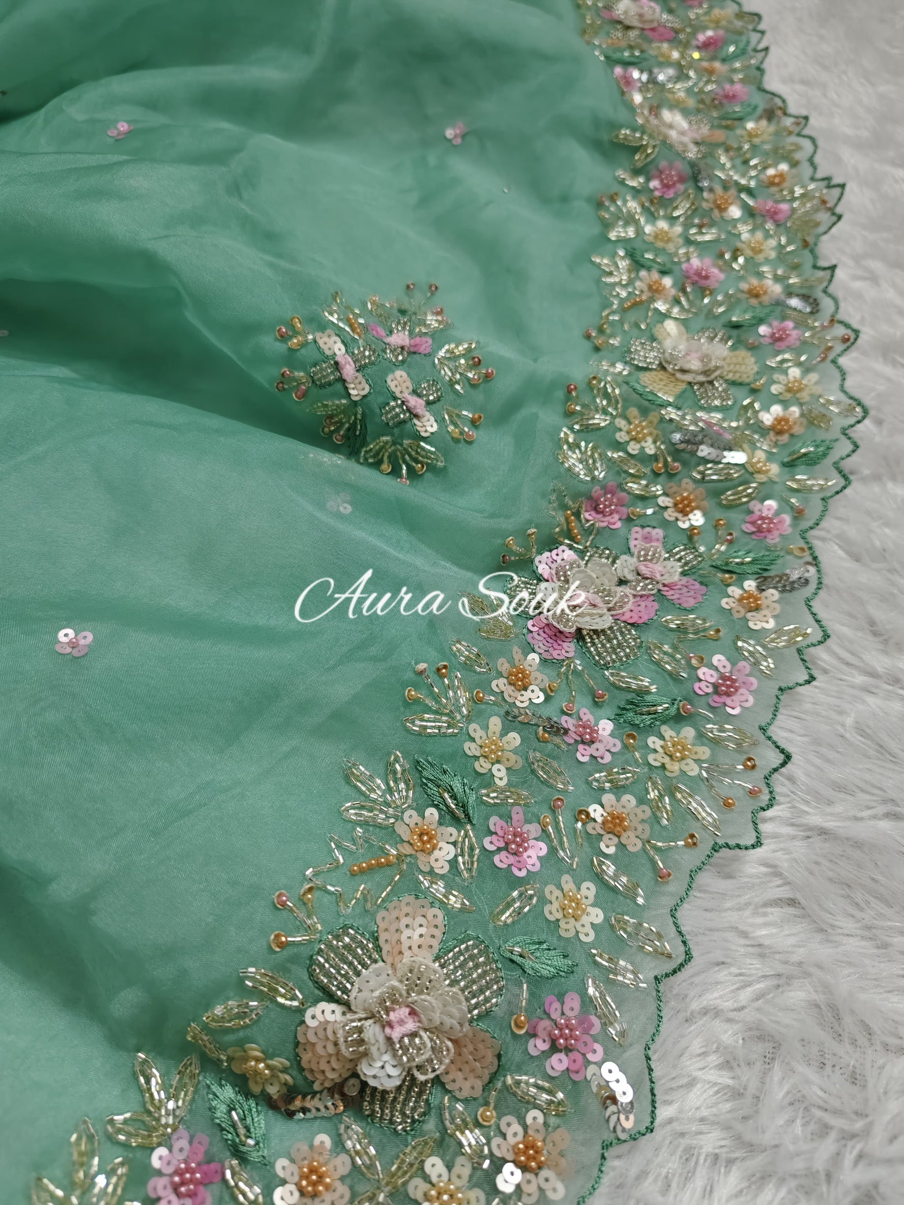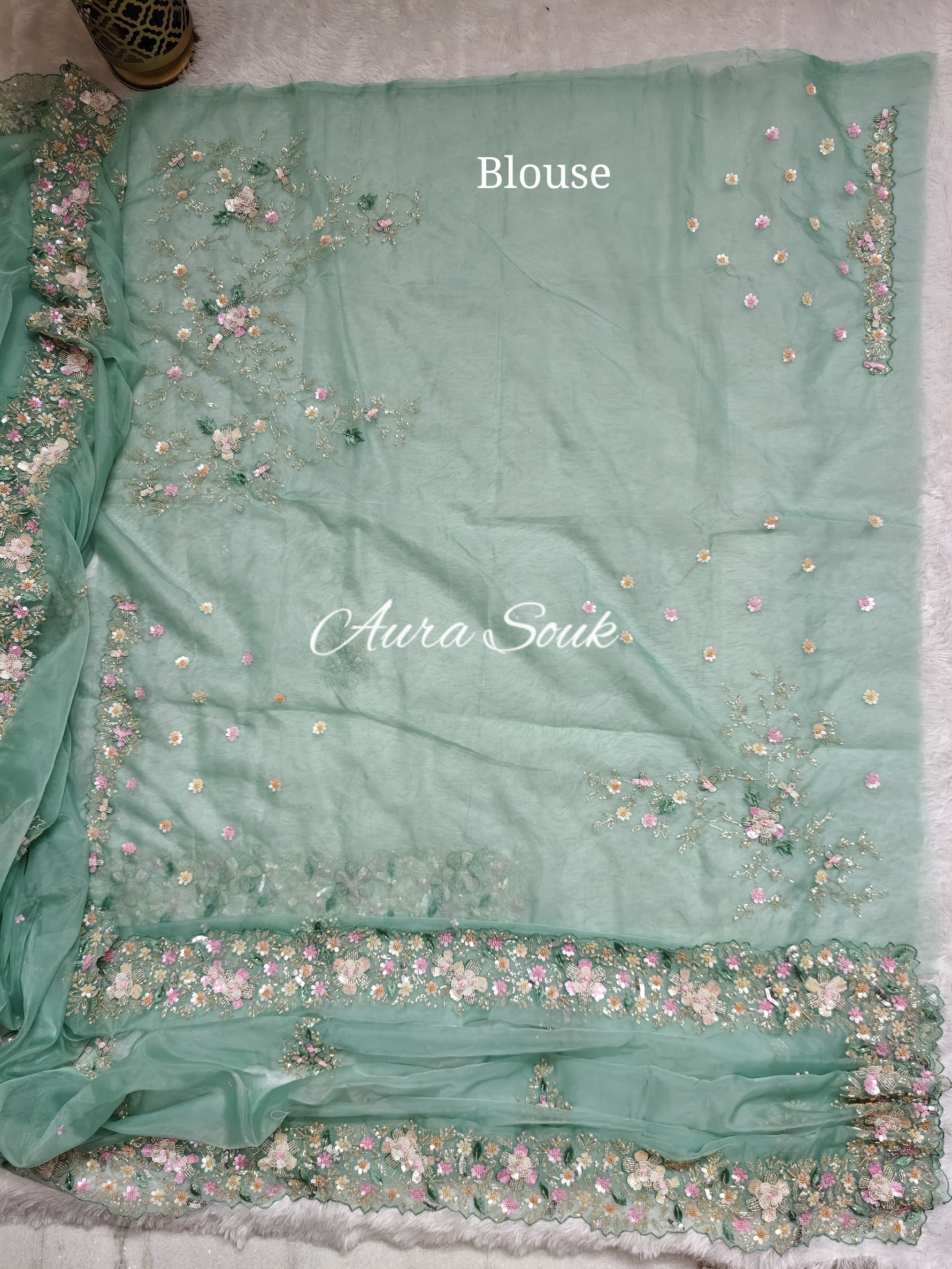 Unit price perAura Souk launches in-house design on Pure Organza with 3D embossed flowers and hand work using cutdana, sequins, pearls, beads and hand embroidery. Color can be customised if done on pure Organza .