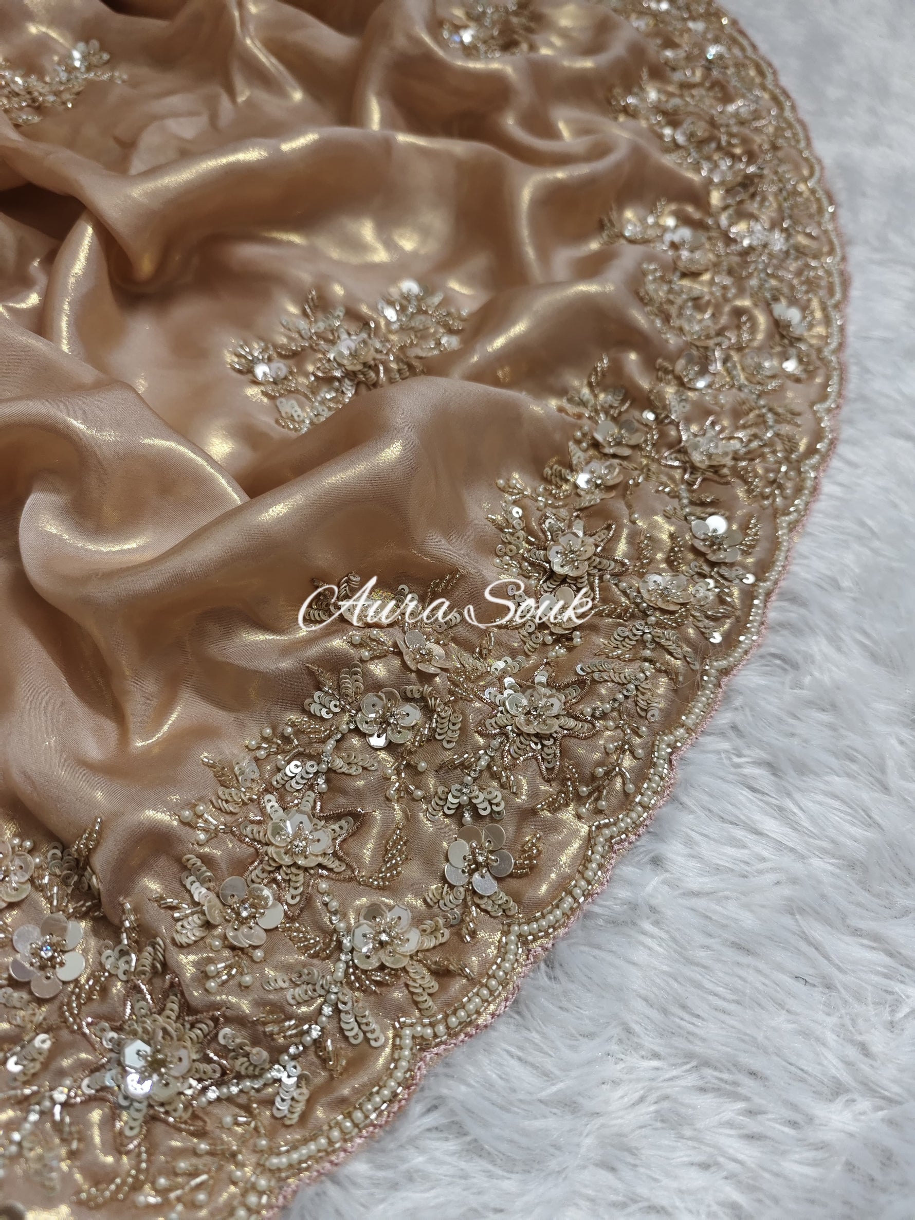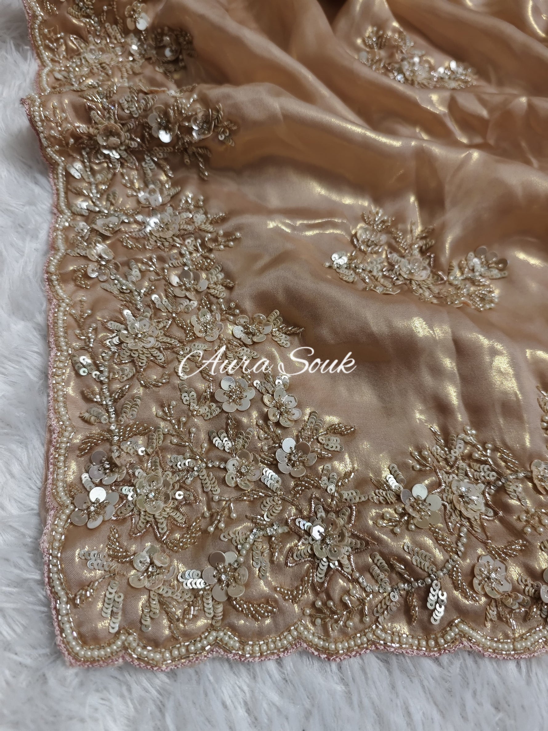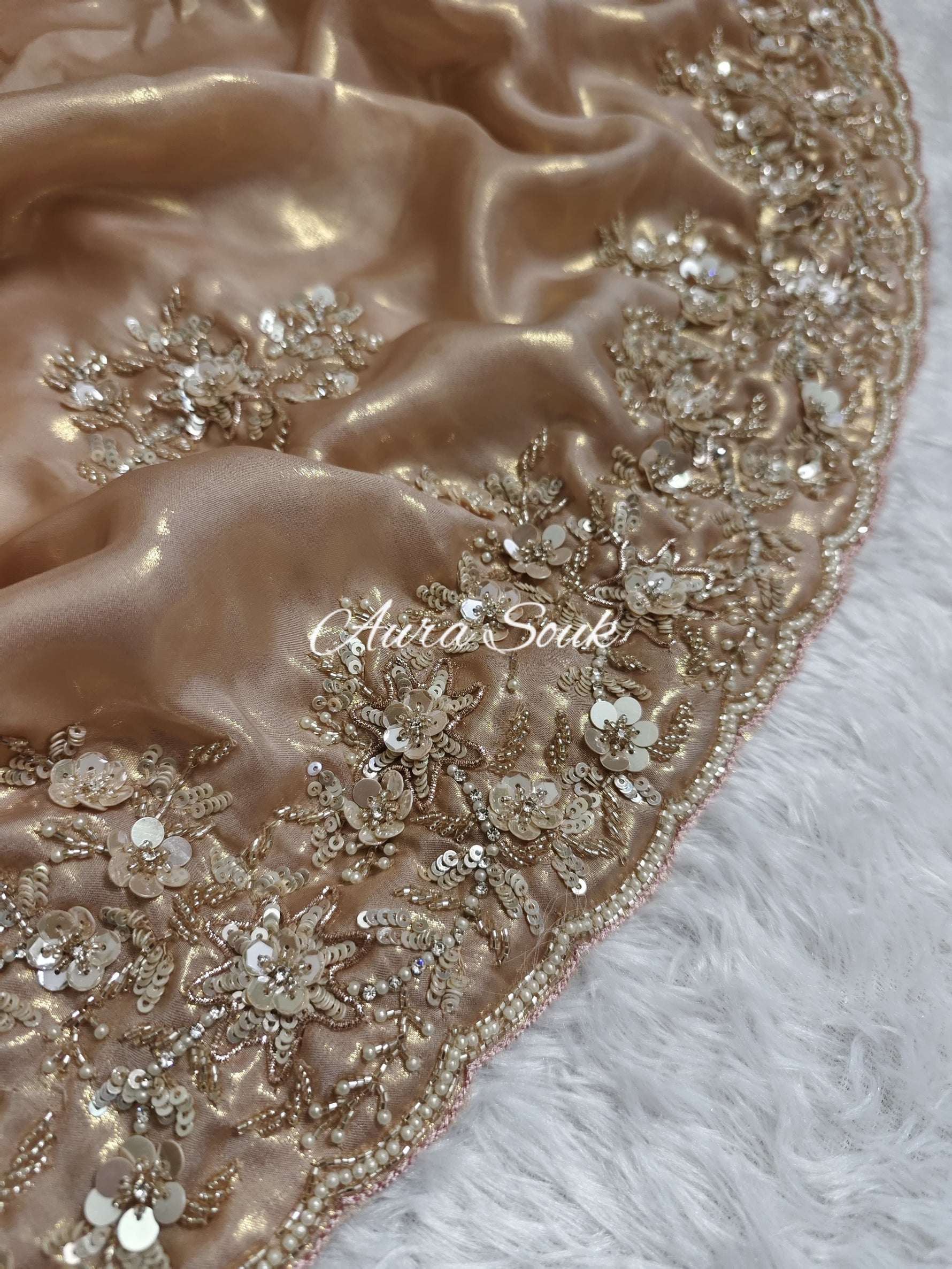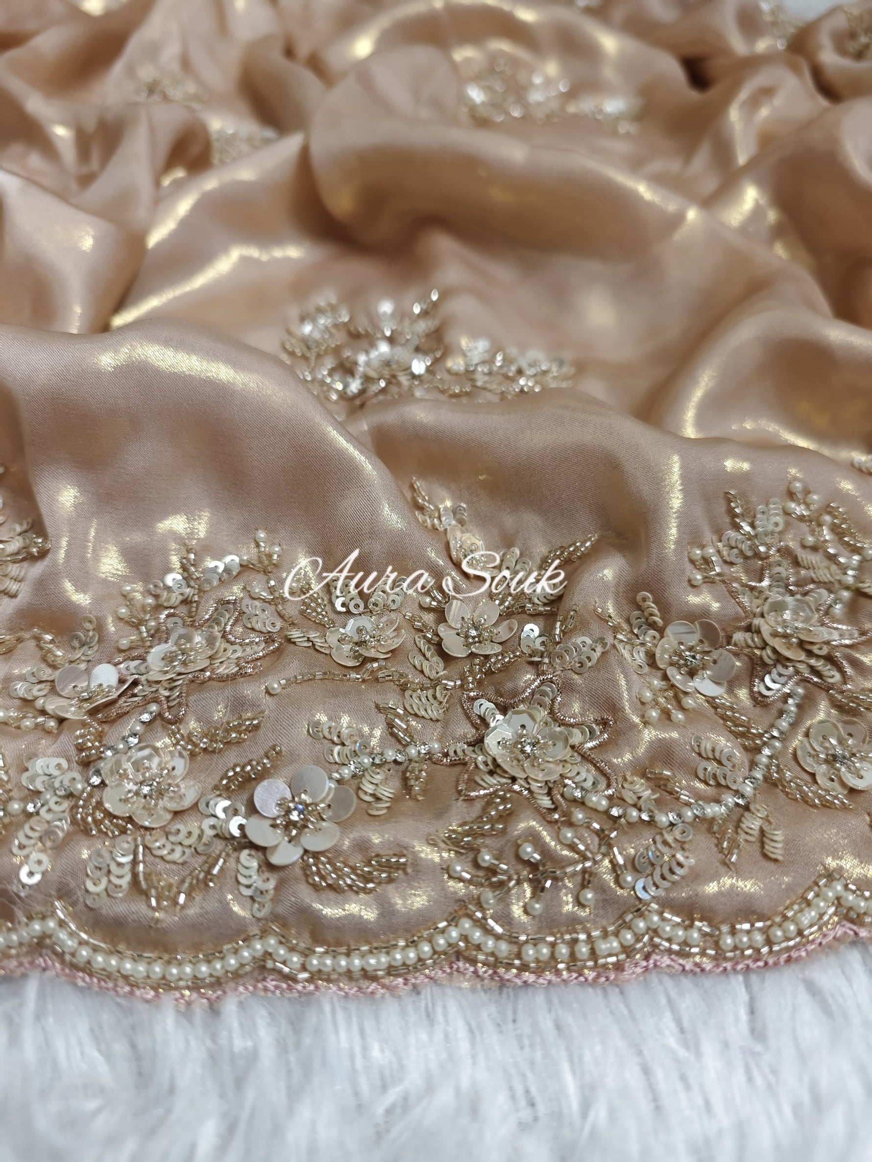 Unbelievably beautiful peach-beige color metallic shimmer crepe silk saree with exquisite hand work all over body and scalloped borders. It has pearls, beads, cutdana and sequins work.