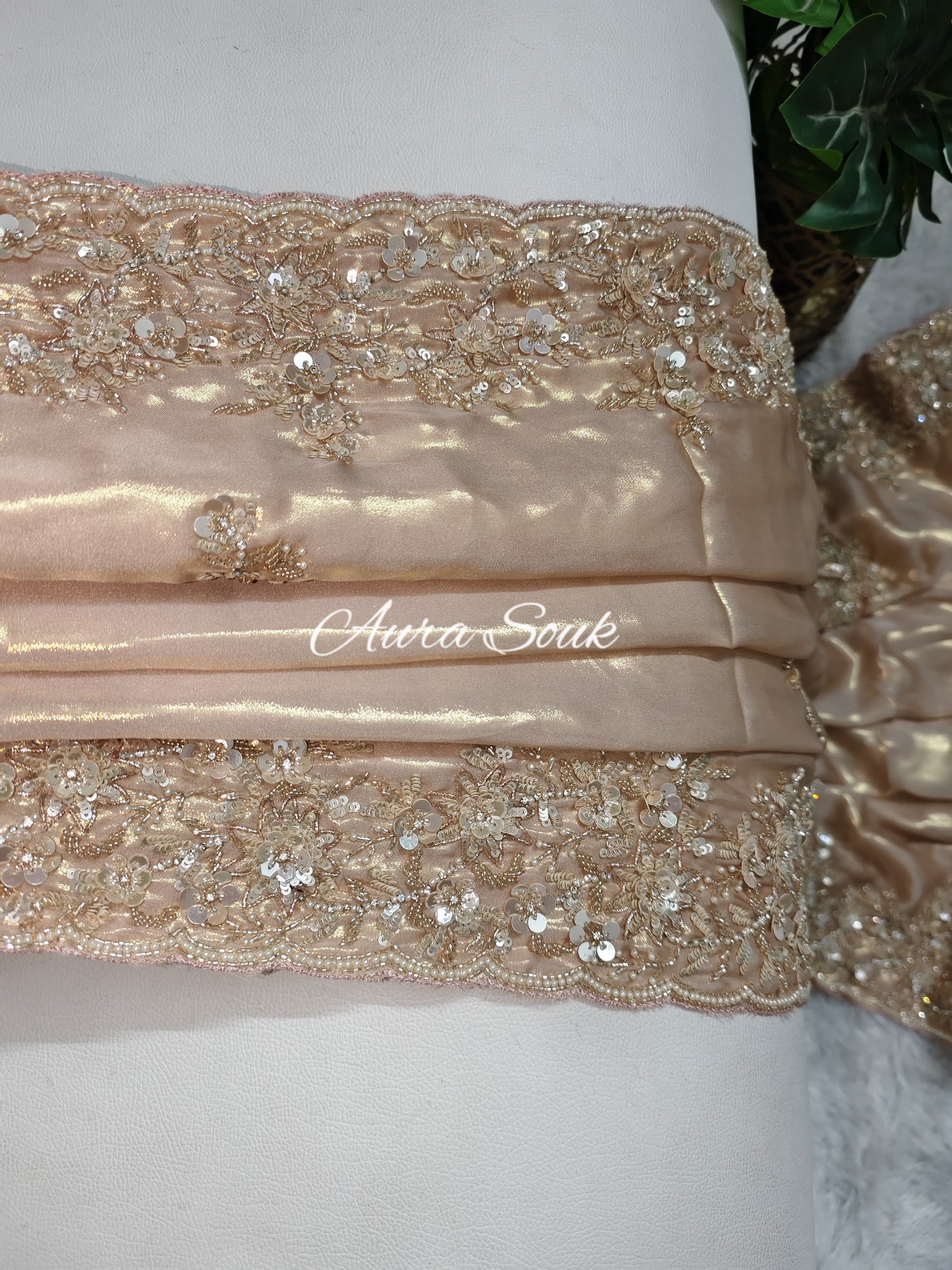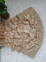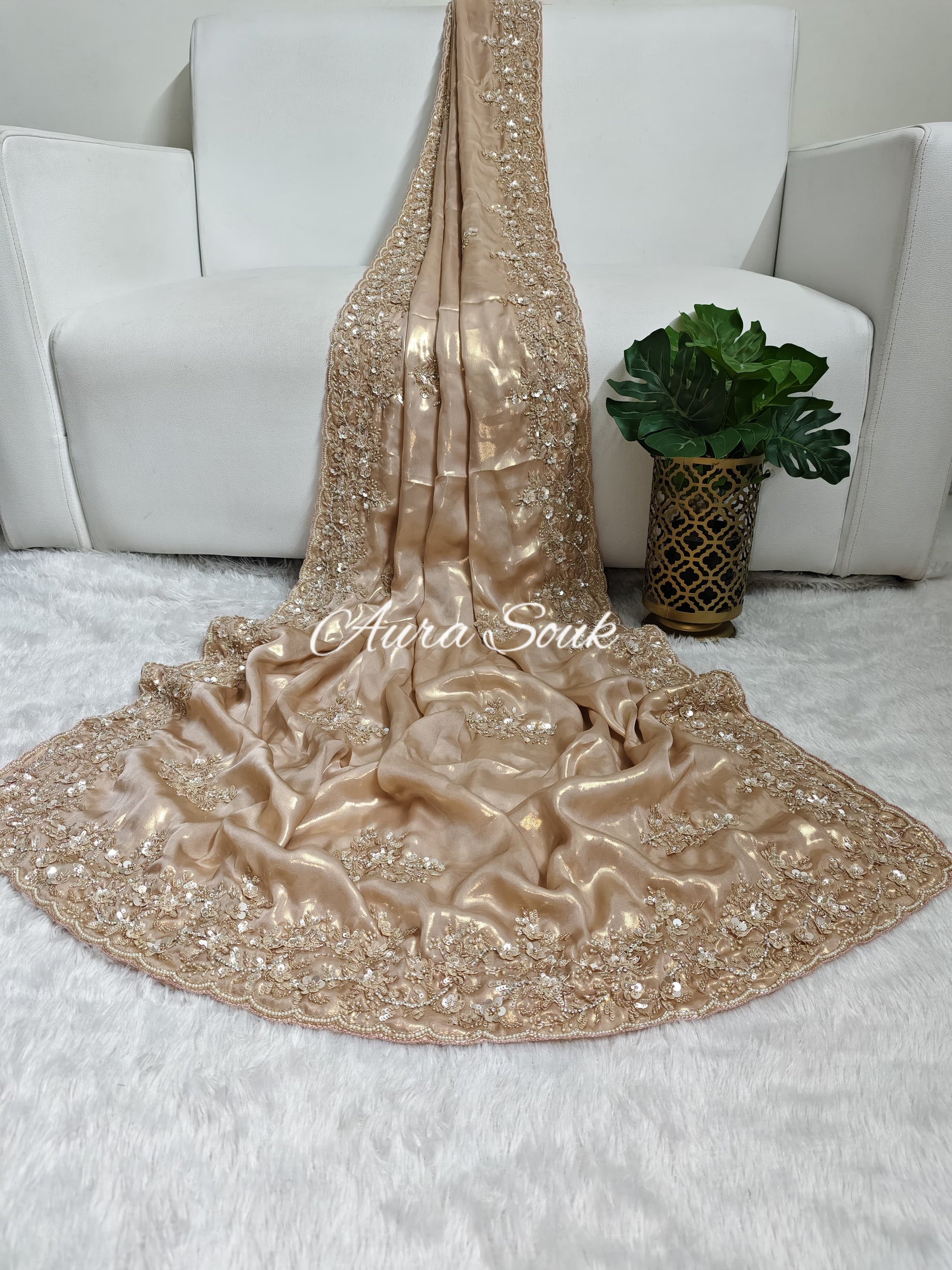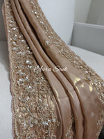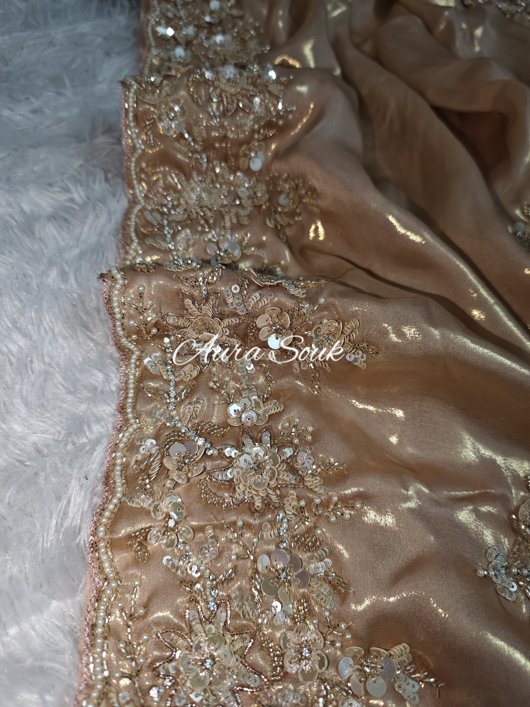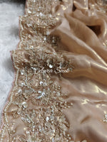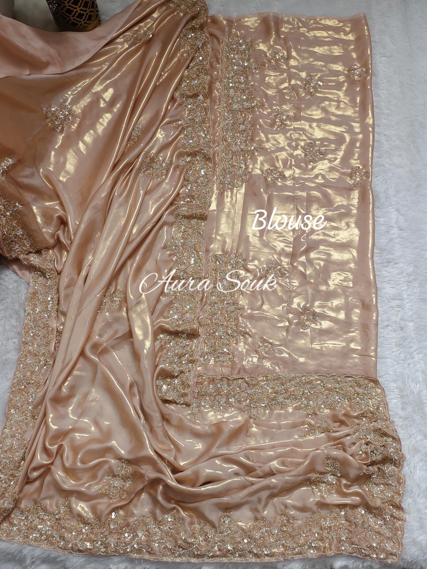 Unbelievably beautiful peach-beige color metallic shimmer crepe silk saree with exquisite hand work all over body and scalloped borders. It has pearls, beads, cutdana and sequins work.